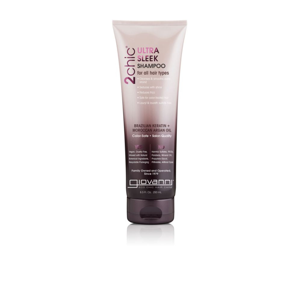 Revel in silky, touchable locks with 2chic® Ultra-Sleek Shampoo with Brazilian Phyto-Keratin, Moroccan Argan Oil, and plant-sourced protein that’s perfect for an oily scalp and hair with dry ends. Continuous use of color treatments, chemicals, or dry heat application from blow drying and/or styling irons may critically damage hair, resulting in a dull, flat appearance. Natural nourishment from Keratin, Argan oils, Coconut, and Shea Butter can reverse the deterioration and restore your hair back to its natural beauty. This sulfate-free shampoo will not dull, strip color, or damage your hair. It’s color-safe, paraben-free, and cruelty-free. Giovanni hair care…bridging the gap between natural and salon quality. For all hair types: